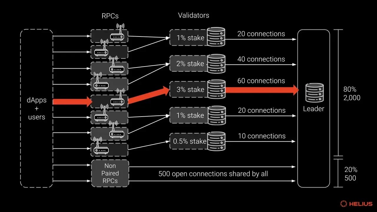 Solana eliminates the need for a global mempool by relying on a deterministic leader schedule influenced by a stake-weighted algorithm known as Stake-Weighted Quality of Service (SWQoS) to prioritize transaction messages that are routed through staked validators. Since the leader schedule is known by all active nodes ahead of time, transaction messages can be distributed without any chatter overhead, therefore ensuring upcoming leaders already have transactions to process before they are scheduled to produce a block. This mechanism allows validators to execute transactions ahead of time, reduce confirmation periods and reduce memory pressure as a result of unconfirmed transactions on validators. Therefore under high load, validators can execute transactions ahead of time and drop failed transactions.