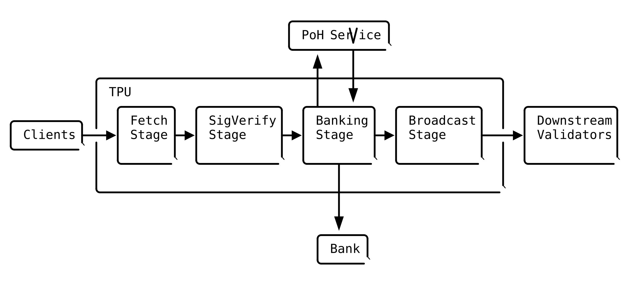 The TPU is the pipeline of the validator that is responsible for block production. Transactions are fetched from the client and forwarded in data packets through a component called the quic streamer which allocates the packet memory and reads the data from the QUIC endpoint (this is known as the “Fetch Stage”). Each stream is used to transmit a packet within a QUIC transmission constraint identified by the client (IP address, Node pubkey) and the server.