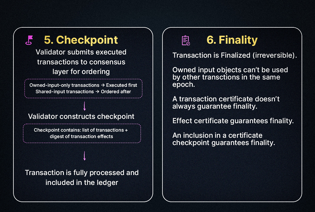 After this, a transaction moves on to being included in a checkpoint which indicates its final stage in its life cycle. As validators execute transactions, they are submitted to consensus layer for ordering where owned-input-only-objects transactions are executed first compared to shared input objects. Checkpoints are created when transactions are ordered and must be complete.