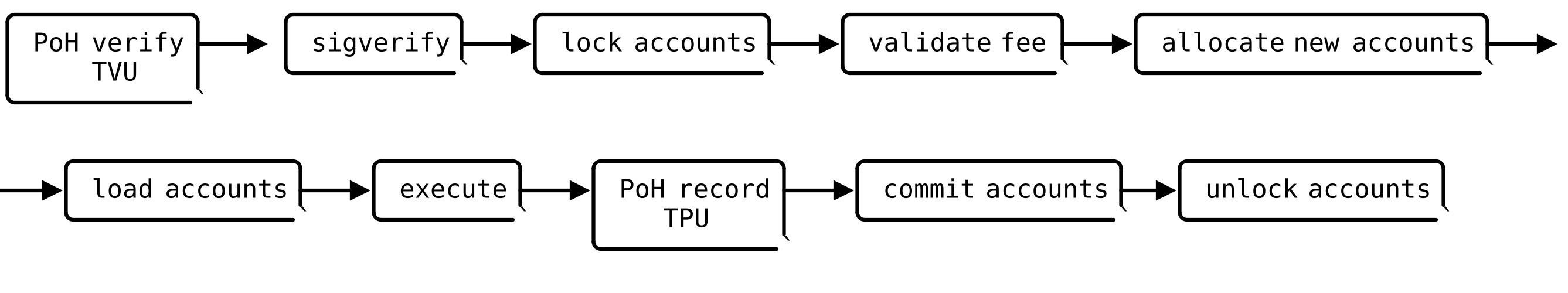 Solana is designed on an account-centric model, and transactions undergo a series of multi-threaded processes and pipelines to ensure their validity. Transactions are submitted to the leader which runs the TPU pipeline to ensure transactions are verified and scheduled accordingly; parallel if they do not conflict and sequential if they do. When a validator is not producing blocks, it runs the TVU pipeline for replaying transactions and validating them. Both the TPU and TVU use the runtime. As a result, Solana processes thousands of transactions in very short periods because the runtime can infer upfront and deterministically, non-overlapping accounts and execute transactions that do not conflict in parallel making Solana very ideal for real world cases like high frequency trading, deep composable DeFi, infrastructure heavy dApps and low-latency consumer dApps.