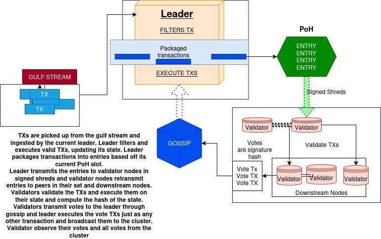 From a high-level overview, transactions are submitted via a client and processed through the gulf stream via QUIC to a leader’s TPU where it is forwarded in batches, undergoes a couple of verification checks, and is then scheduled by the banking stage and forwarded to the Sealevel for execution. State updates are written back into the bank’s in-memory state and validators vote on blocks through gossip and blocks are finalised using Tower BFT which is a PBFT variant with stake-weighted lockouts mechanisms.
