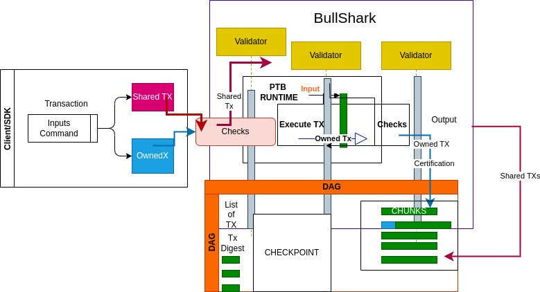 Afterwards, transactions are broadcasted via Narwhal (Sui’s Mempool), and sequenced via Bullshark (Sui DAG-based consensus engine) which sequences the transactions in a total order.