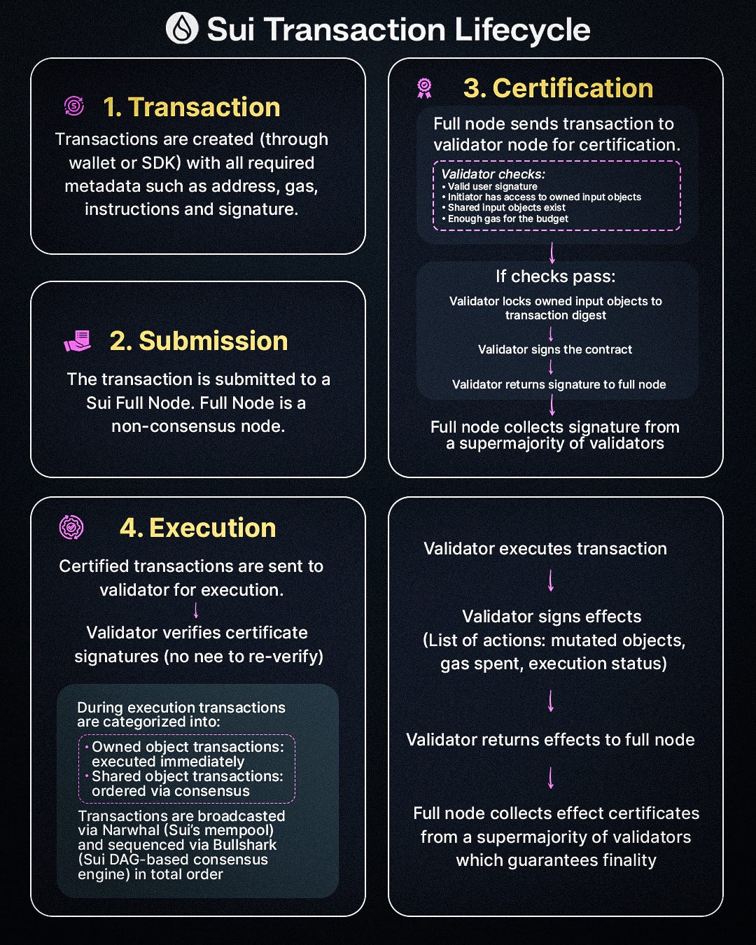 As stated earlier, understanding the lifecycle of a transaction can be the clearest expression of a blockchain’s design philosophy. The differences in the transaction lifecycle between Solana and Sui exposes deep execution model philosophies across three critical vectors: scalability thresholds, execution efficiency and design trade-offs.